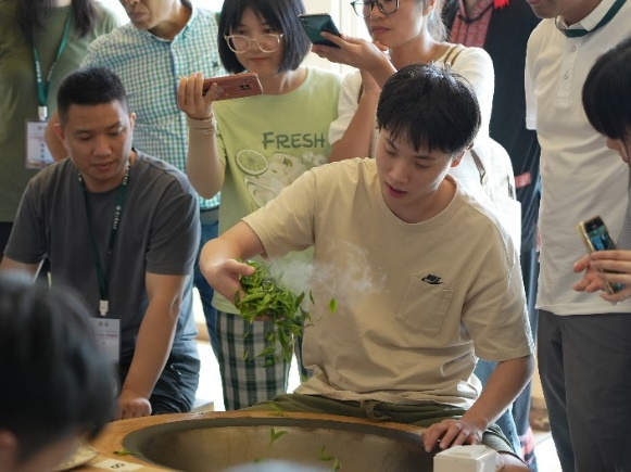 参观期间,樊生华的徒弟向各位学员分享了龙井茶炒制的技巧和经验。据介绍,西湖龙井的“色香味形”,主要依靠手工炒制工艺。虽然机器炒茶可以大大提高生产效率,但西湖龙井茶区的许多茶农,在炒制中高档龙井茶时依旧采用手工。他还耐心为学员们讲解了绿茶炒制技艺及特点,包括炒制手法、锅温控制等。学员们听后积极尝试,炒茶房内茶香四溢。炒制之余,施跃文、王业才等学员还热烈探讨了不同地区茶叶炒制手法特点的异同。