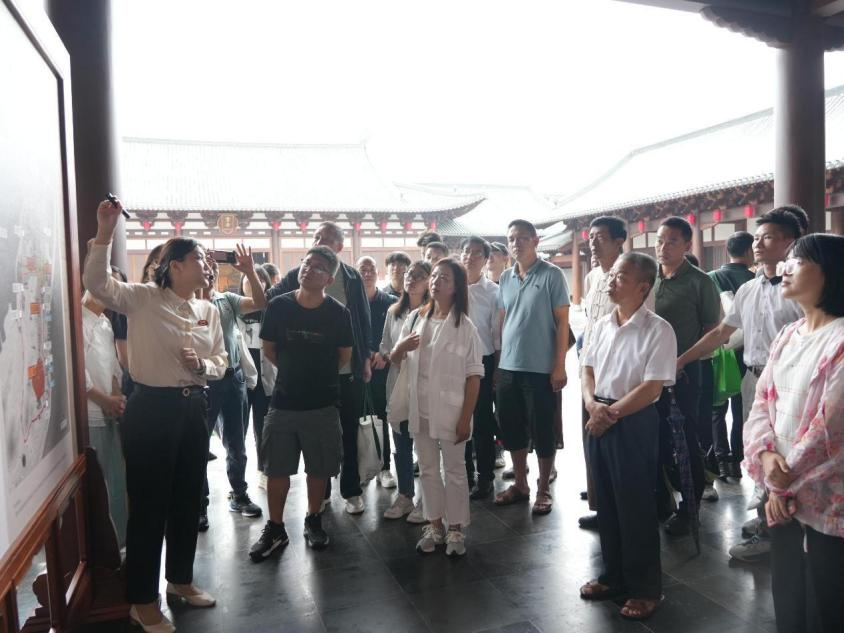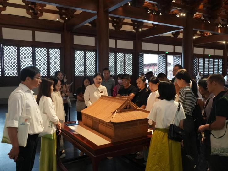 大殿外的亭台楼阁错落有致,重建的重华宫内,斗拱、藻井细致精巧,琳琅满目,宋代茶饮物件陈设古朴典雅,讲解员给学员们介绍了德寿宫的历史变迁,分享了曾居住在德寿宫的高宗、孝宗以及两宫太后的历史故事,简述了遗址整体格局复原的过程。
