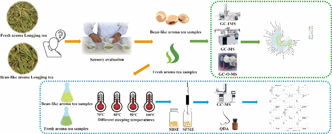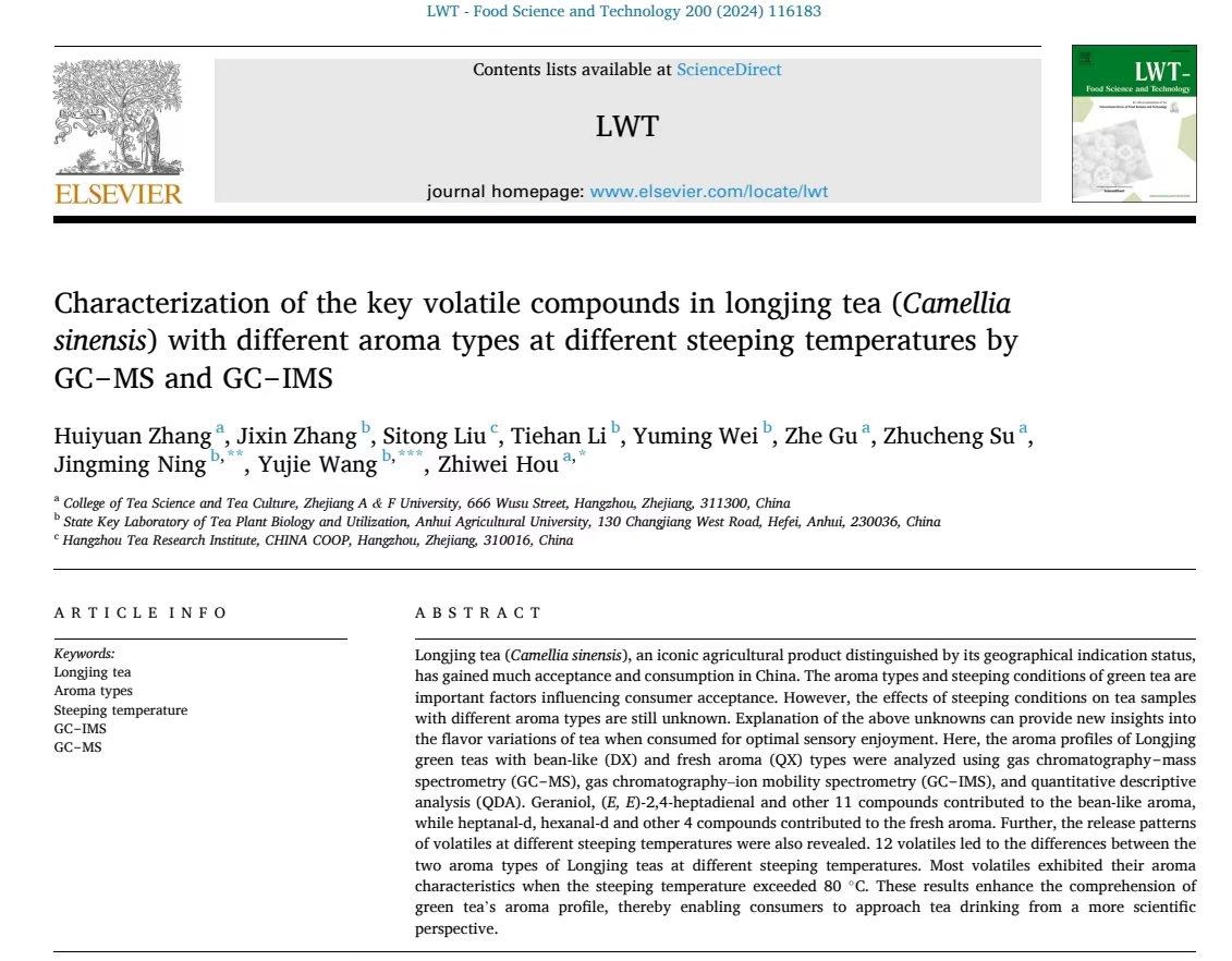 2024年5月7日,侯智炜老师指导2021级本科生张汇源在国际著名期刊《LWT-Food Science and Technology》(中科院一区Top,IF=6.0)上发表题为"Characterization of the key volatile compounds in Longjing tea (Camellia sinensis) with different aroma types at different steeping temperatures by GC‒MS and GC‒IMS"的研究论文。该研究分析了不同香型龙井茶的香气特征,并揭示了不同冲泡温度下各种香型龙井茶的挥发性物质的释放规律,从科学的角度进一步解释了龙井茶的特征香气品质,也为消费者科学饮茶提供了重要参考。