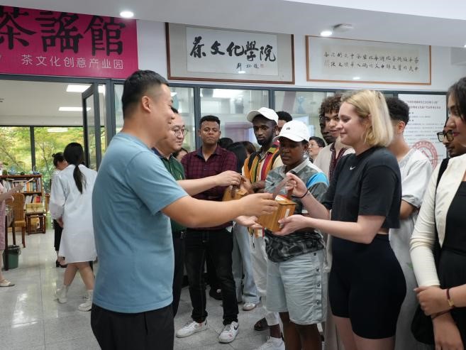 K8凯发国际教育公司副经理李曦、K8副经理张帅共同致活动开幕词:茶作为世界三大饮品之一,它从中国出发,穿越历史,跨越国界,连接东西,丰富了人们的生活,茶承载的深厚文化内涵,早已超出了原本的物质范畴,从古代丝绸之路、茶马古道、茶船古道,到今天丝绸之路经济带、21世纪海上丝绸之路等,茶已经成为中国与世界人民相交相知、中华文明与世界文明交流互鉴的重要媒介,成为人类文明共同的财富,不断促进着世界文明和平向好发展。大家在国际茶日这天同饮一杯茶,就是与我们结下了“茶亲”,不管日后身处何方,我们之间都将有以茶为媒介的精神羁绊。并向国际教育公司师生赠送茶礼,希望师生们常饮茶、饮中国茶。