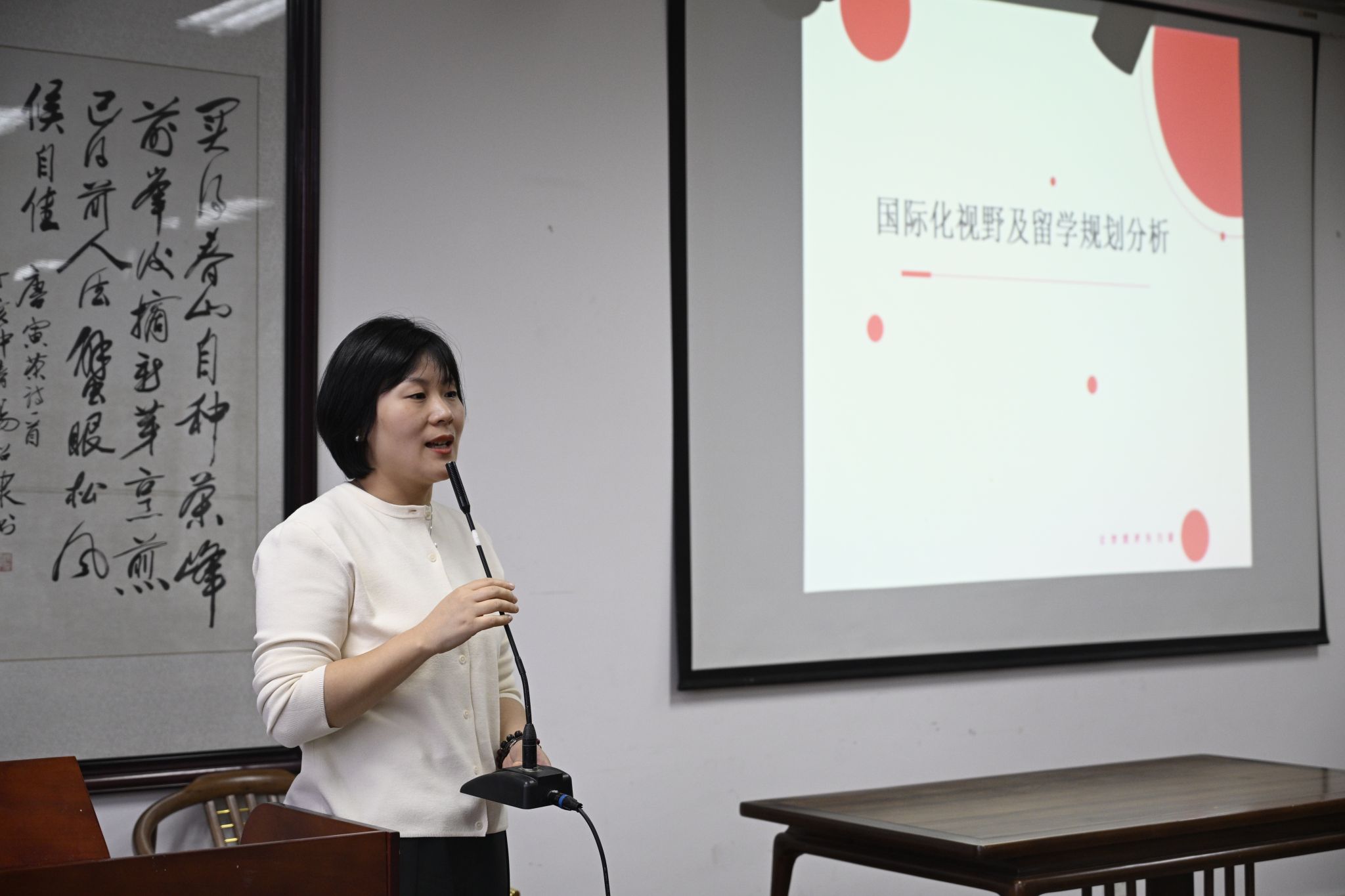 会中,熊蕾老师就国际形势、留学申请流程及要求、留学学业完成难度、语言能力标准、职工资源及便利服务等方面分析了选择各国留学的优势。她强调了语言能力的重要性,希望有意向的同学早做准备,同时期许同学们通过本次宣讲能够有所收获,在今后的学习生活中找准人生坐标,书写属于自己的精彩篇章。