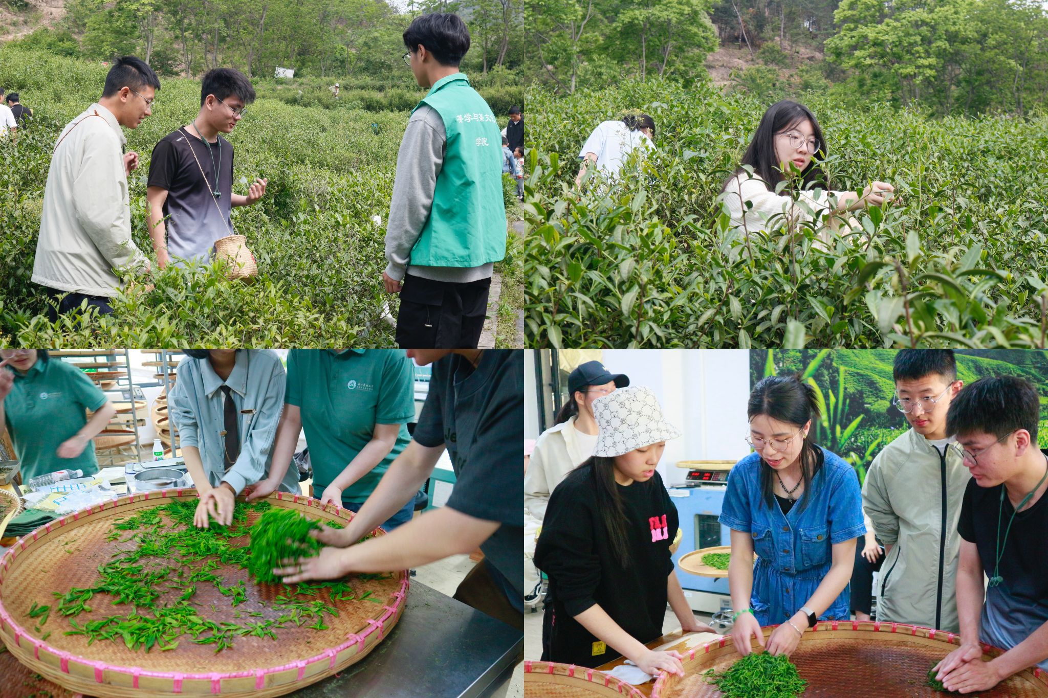 活动分采茶、制茶两大核心环节。在采茶活动中,参赛小组挎上茶篓深入茗茶园,在指尖翻飞间感受春日茶芽的鲜嫩,于实践中领悟采茶门道,实现茶文化理论与田园实践的深度融合;制茶环节则聚焦传统工艺传承,杀青的烟火气、揉捻的手法讲究、干燥的火候拿捏......每一道工序在专业教师的悉心指导下,化作参赛者手中精益求精的“匠心课堂”。师生共同完成从鲜叶到绿茶的蜕变,一杯杯亲手制作的茶品成为传统技艺活态传承的最佳注脚。