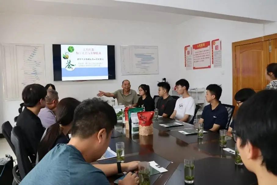 7月19日,实践团赴省级农业龙头企业浙江剑光生态农业科技开发有限公司参观考察,详细了解并现场观摩了由公司茶叶加工团队改造的数智化茶叶揉捻设备。随后,实践团一行与企业青年开展热烈座谈交流,就茶叶新媒体营销策略及“文化赋能+短视频引流”的茶企转型方案展开细致讨论。座谈结束后,团队一行在企业负责人的带领下参观了大柘万亩茶园,深切感受农旅融合在提升茶园综合效益方面的显著成效。